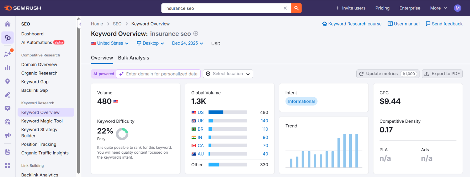 Using tools like Google Keyword Planner or Semrush, insurers can uncover niche, low-competition terms that attract qualified leads.