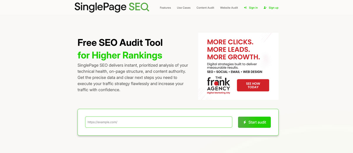 The frank Agency, a full service digital marketing firm with over four decades of proven digital and technology leadership, announced the launch of its newest product: SinglePage SEO, a free, focused SEO audit platform built to analyze and optimize one important URL at a time.